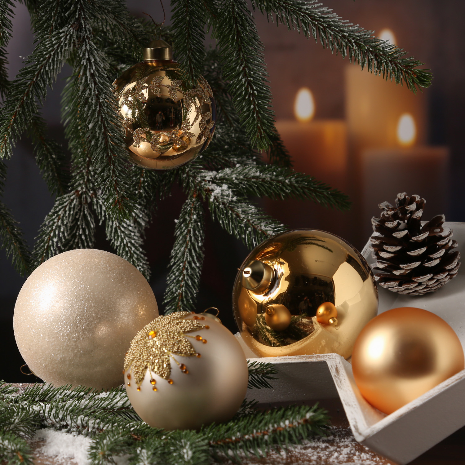 - Erscheinung große Baumkugeln: 1x Glänzend 1x Matt und 2x Glitzernd