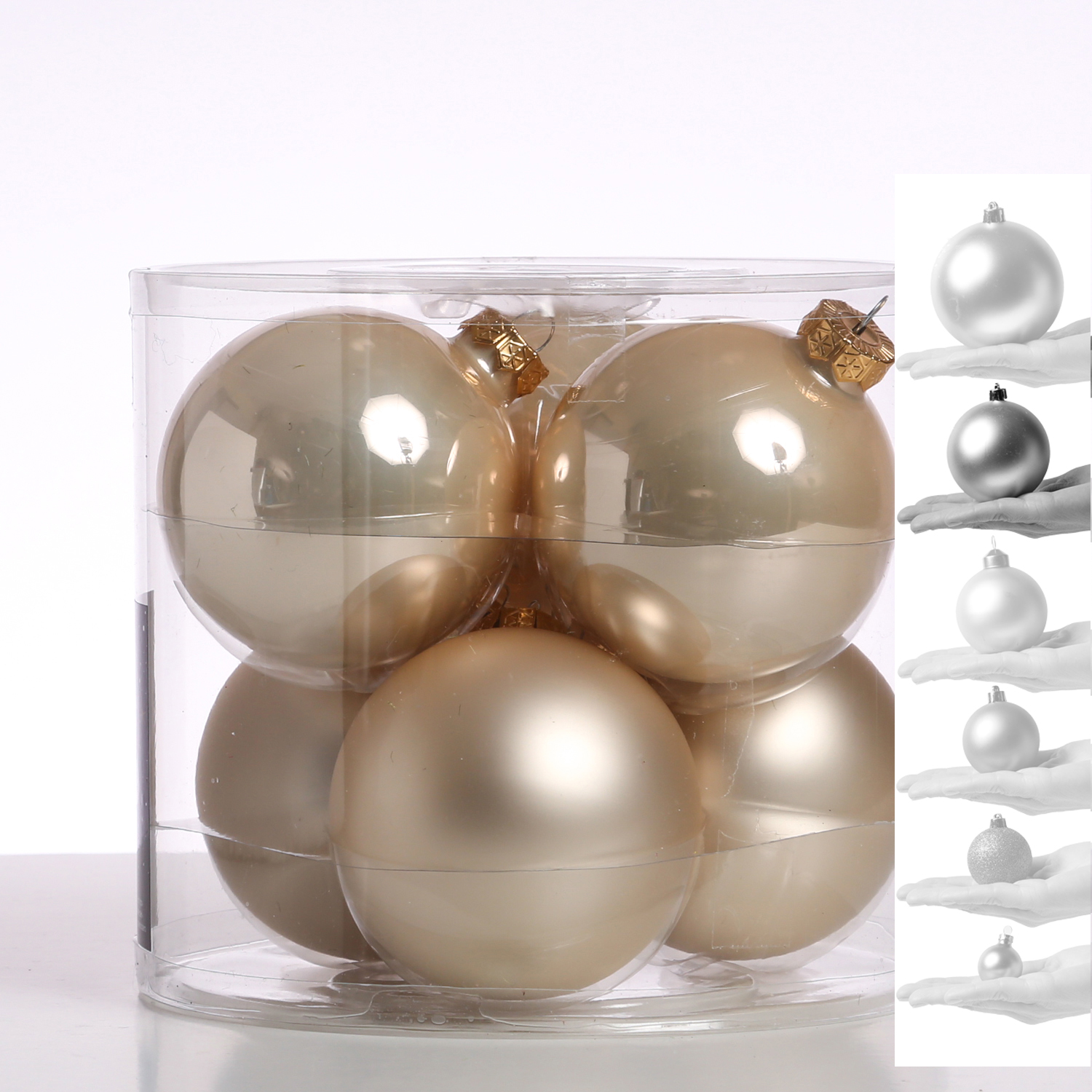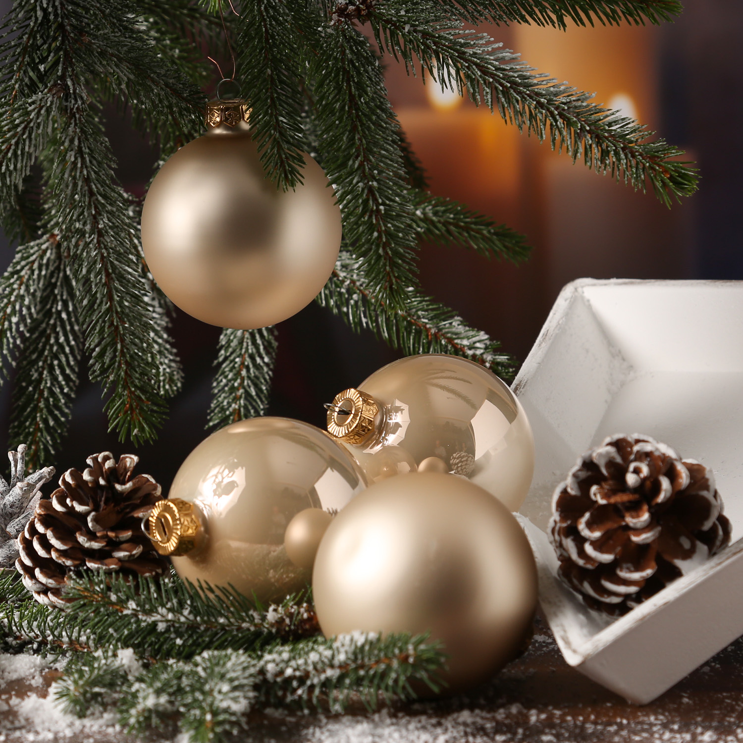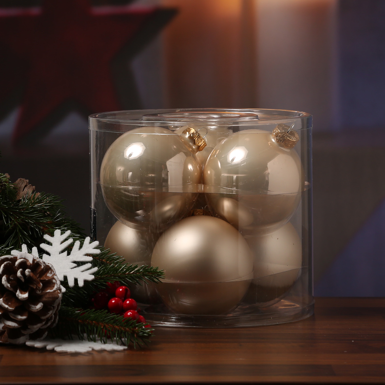 Die wunderschönen champagnerfarbenen Christbaumkugeln aus Glas sorgen nicht nur am Weihnachtsbaum in Deiner Wohnung für eine festliche Stimmung. Die Baumkugeln sehen auch besonders gut als Deko für Fenster, Schalen und Glasgefäße aus. Aber auch im Adventskranz, in Adventssträußen oder Gestecken können die Christbaumkugeln hervorragend dekoriert werden.