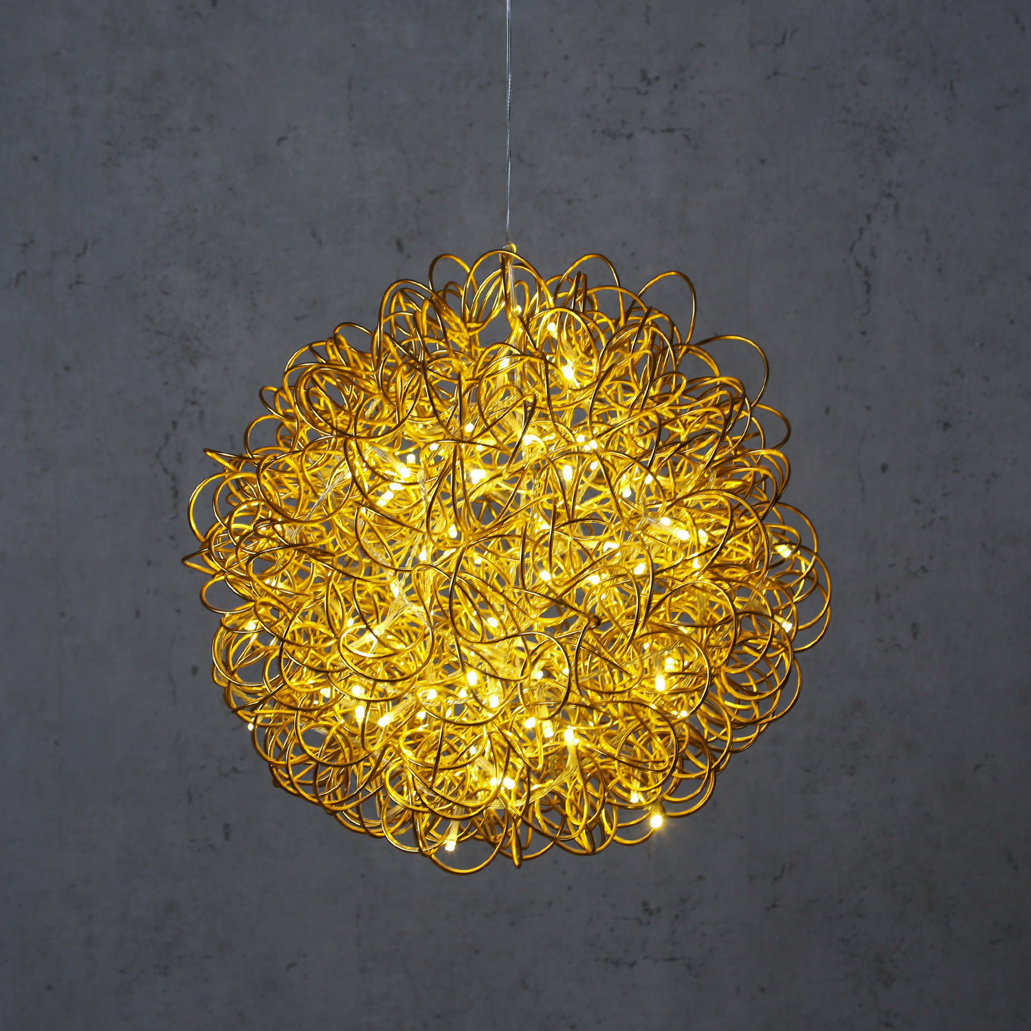 Diese besonders schöne LED Drahtkugel ist sowohl im Wohnraum als auch im Garten eine echte Augenweide. Die Kugel ist aus einem dicken goldenen Aluminiumdraht von Hand gewickelt. Dann wurde eine transparente Lichterkette mit 100 warmweiß leuchtenden LED eingewoben.
