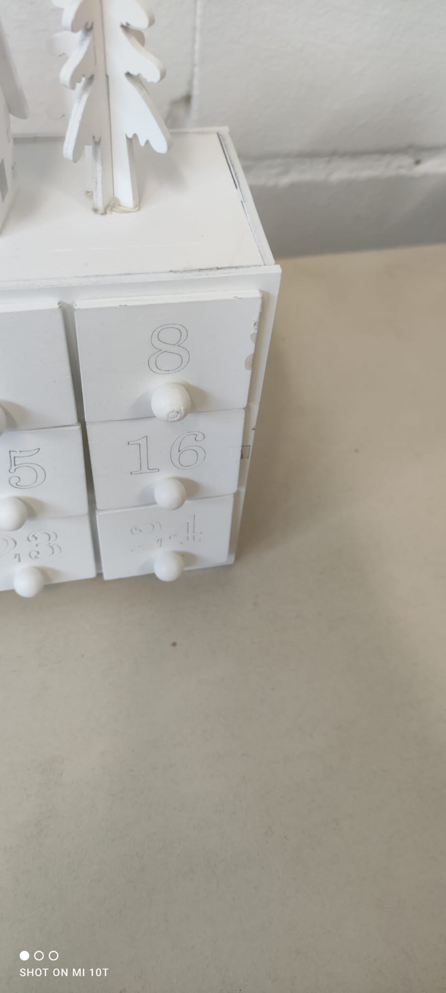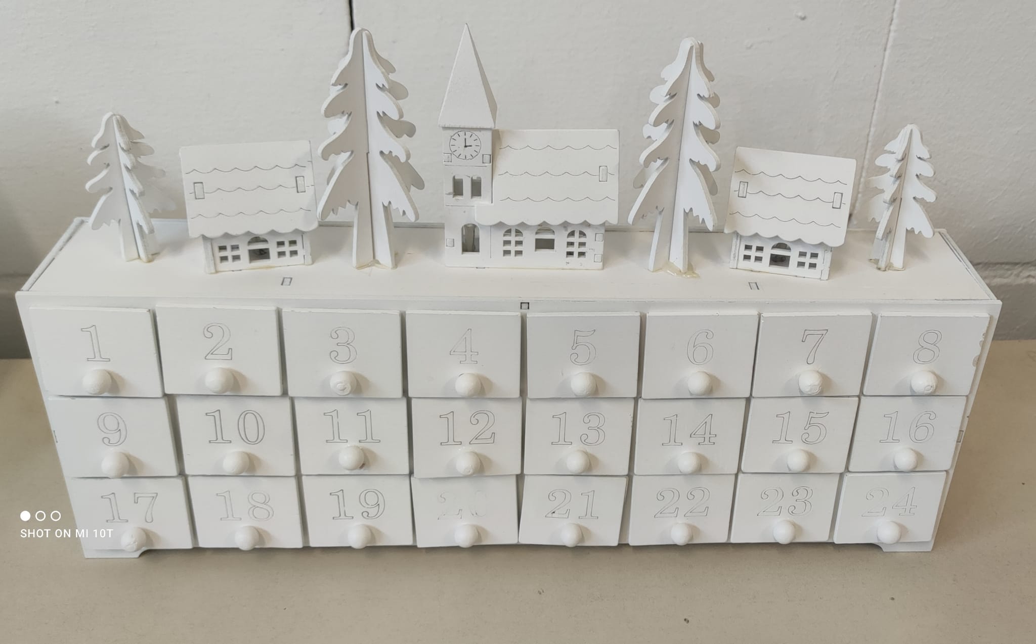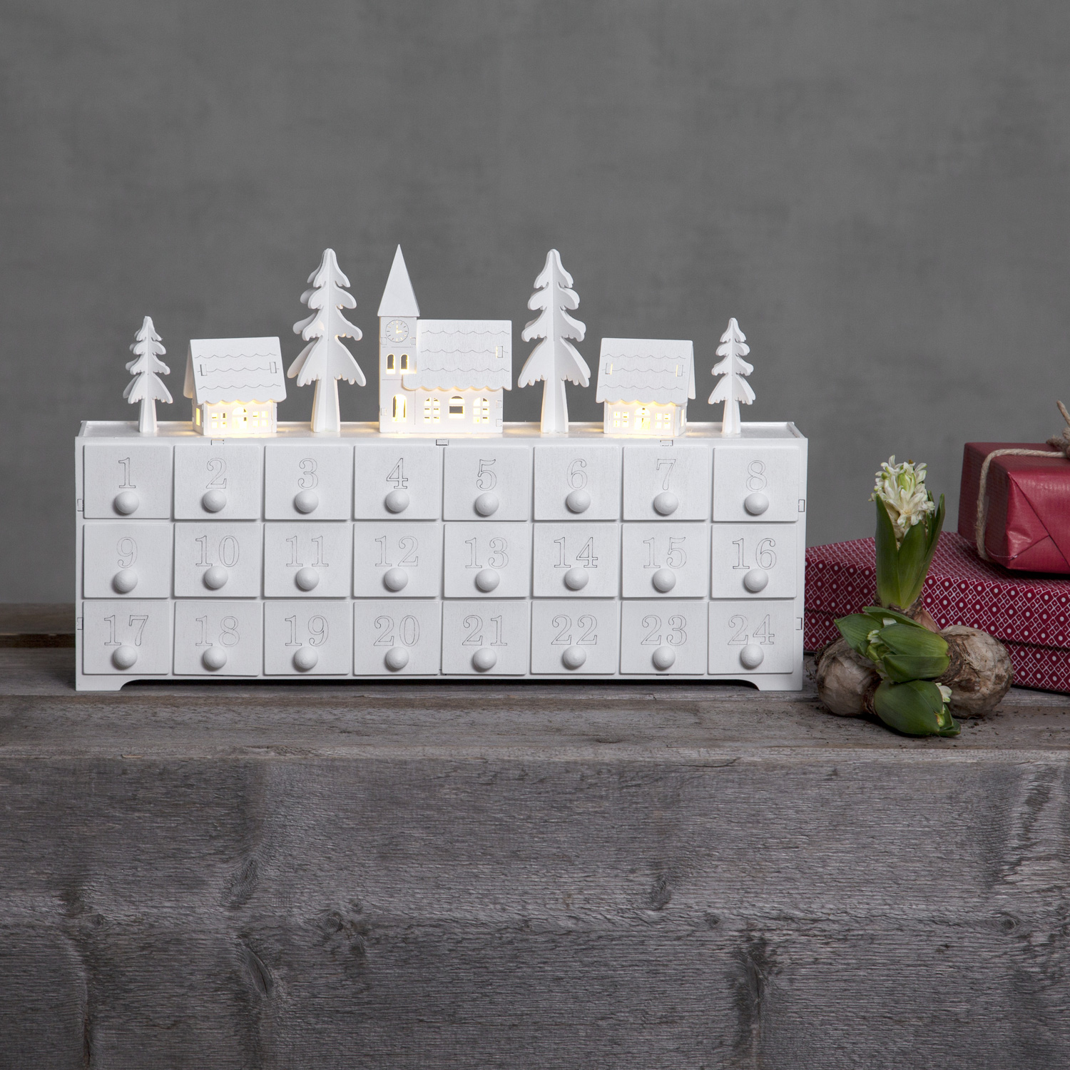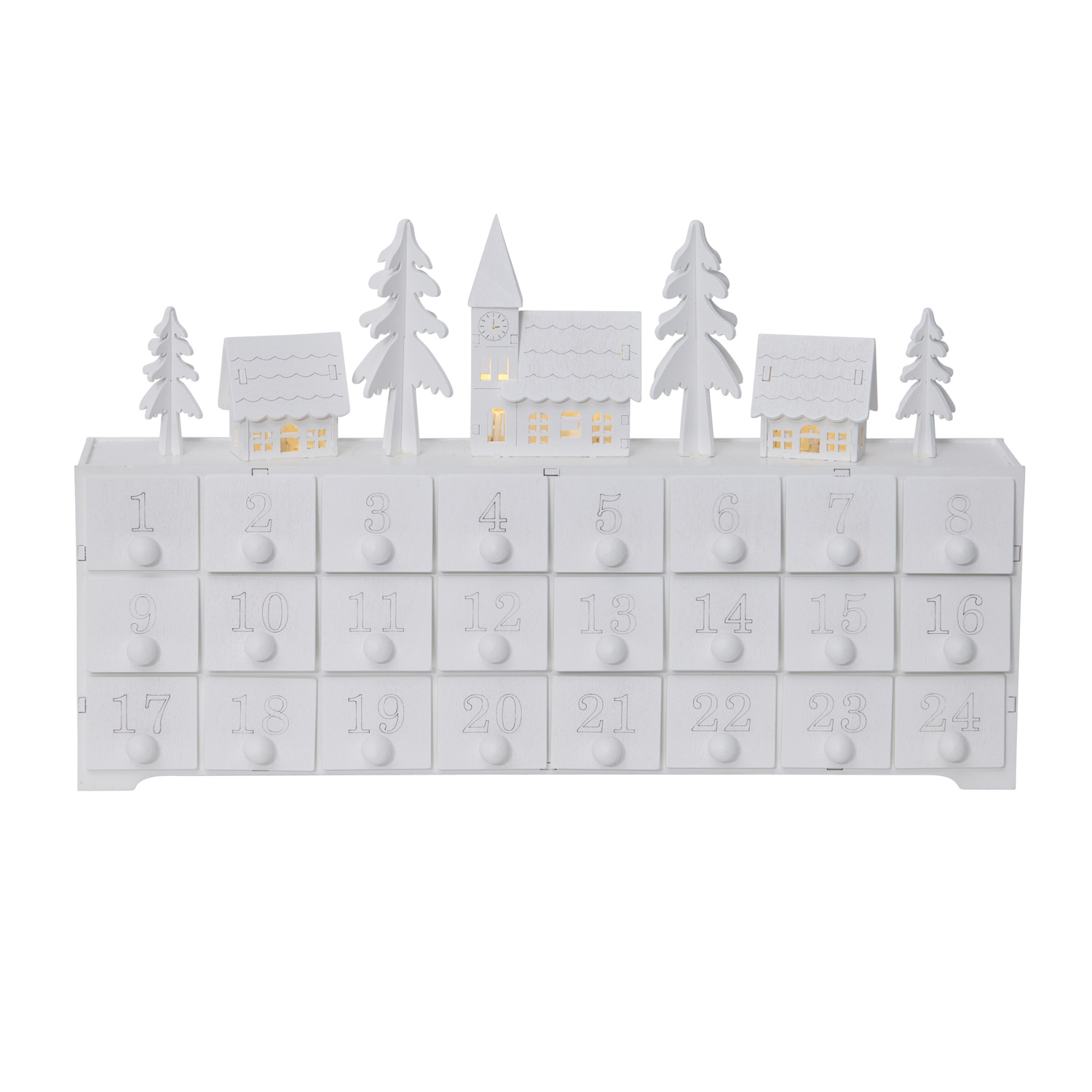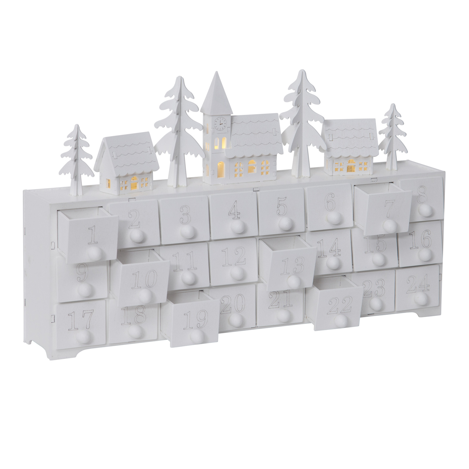 Dieser schöne Adventskalender aus weißem Holz hat 24 Schubladen für kleine Überraschungen. Auf dem Holzkästchen befinden sich drei Holzhäuschen, die von innen mit warmweißen LED beleuchtet sind.