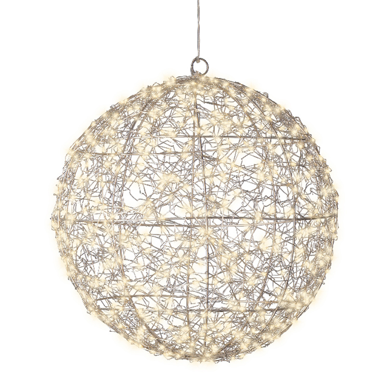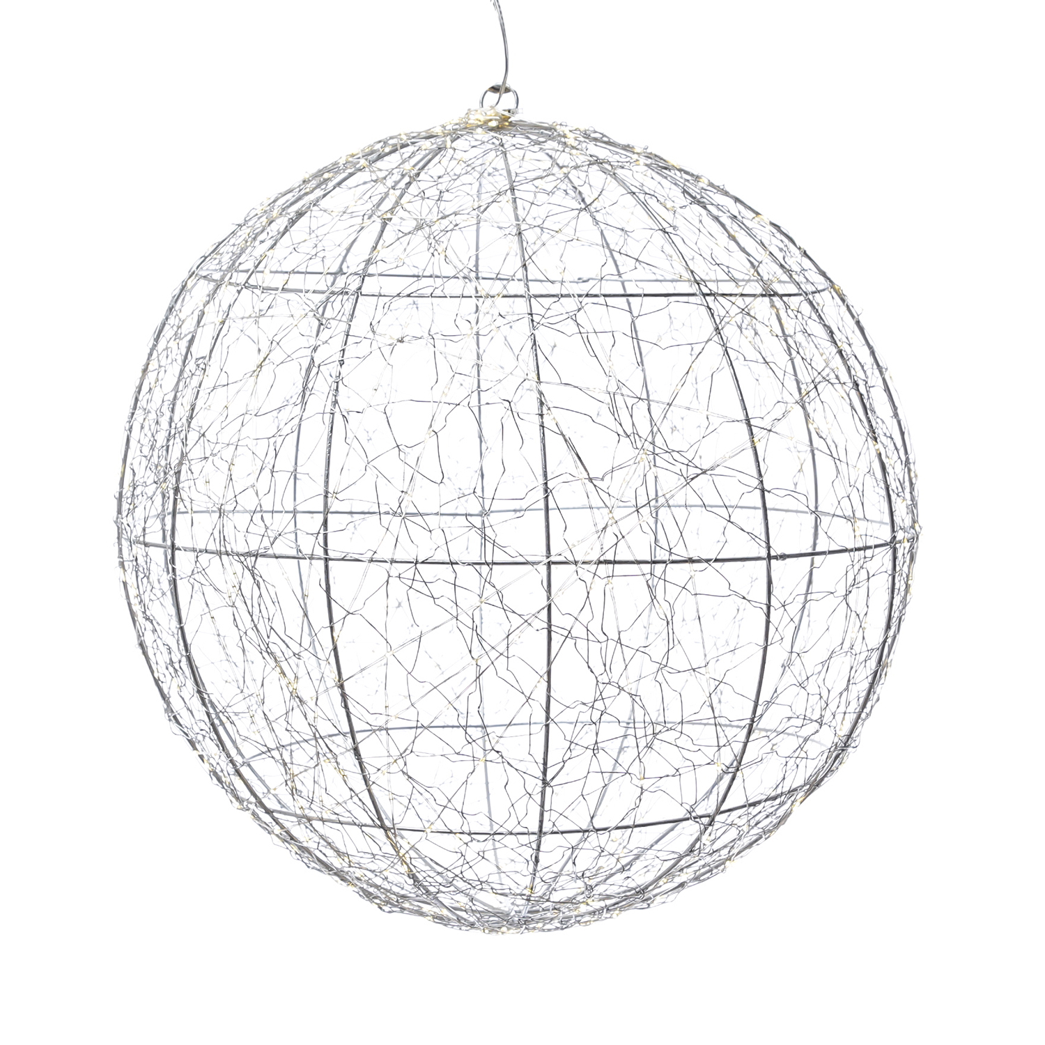 Die silberne Drahtlichterkette, die in die Kugel eingeflochten wurde, hat insgesamt 600 warmweiß leuchtende Micro LED, die in gemütlichem Licht leuchten.