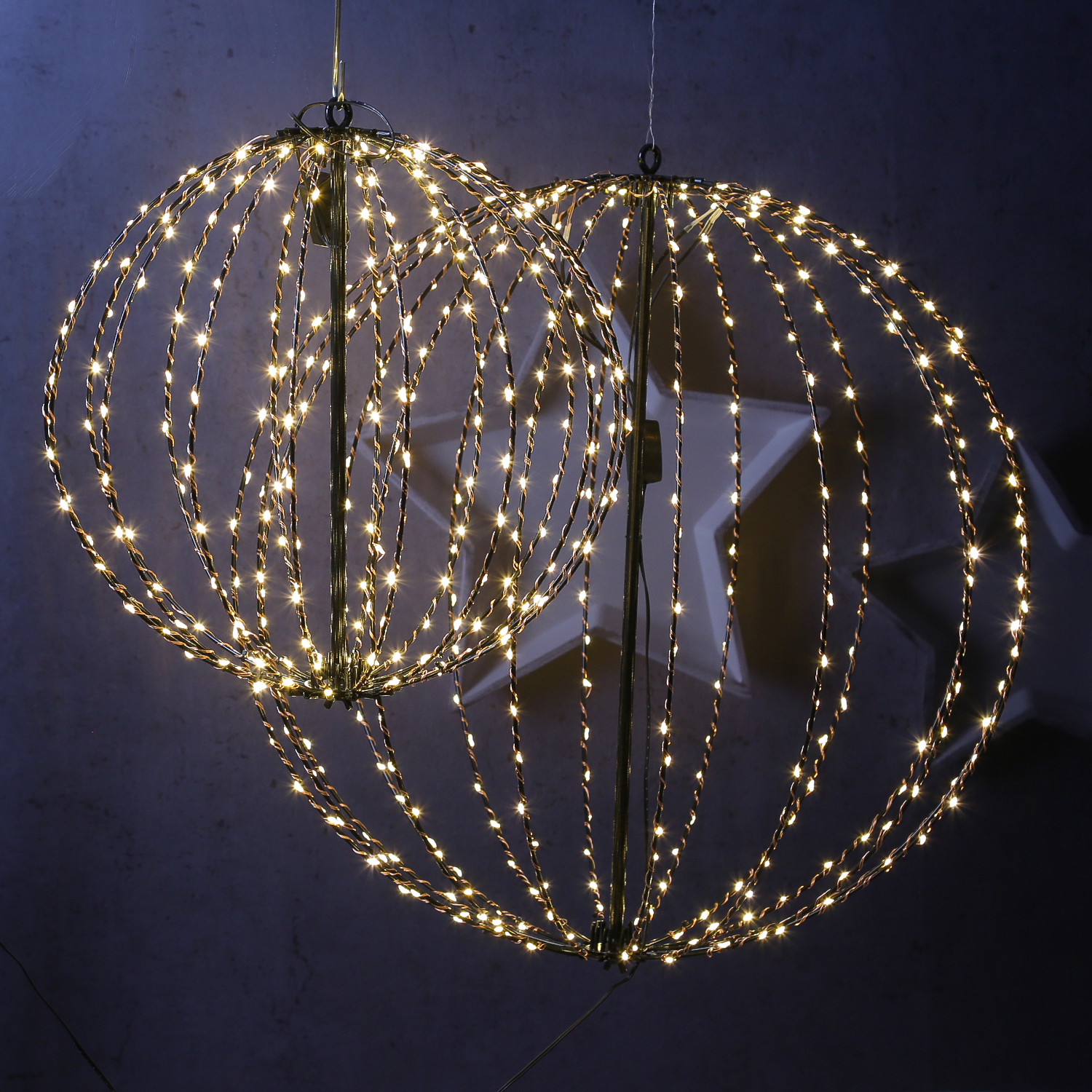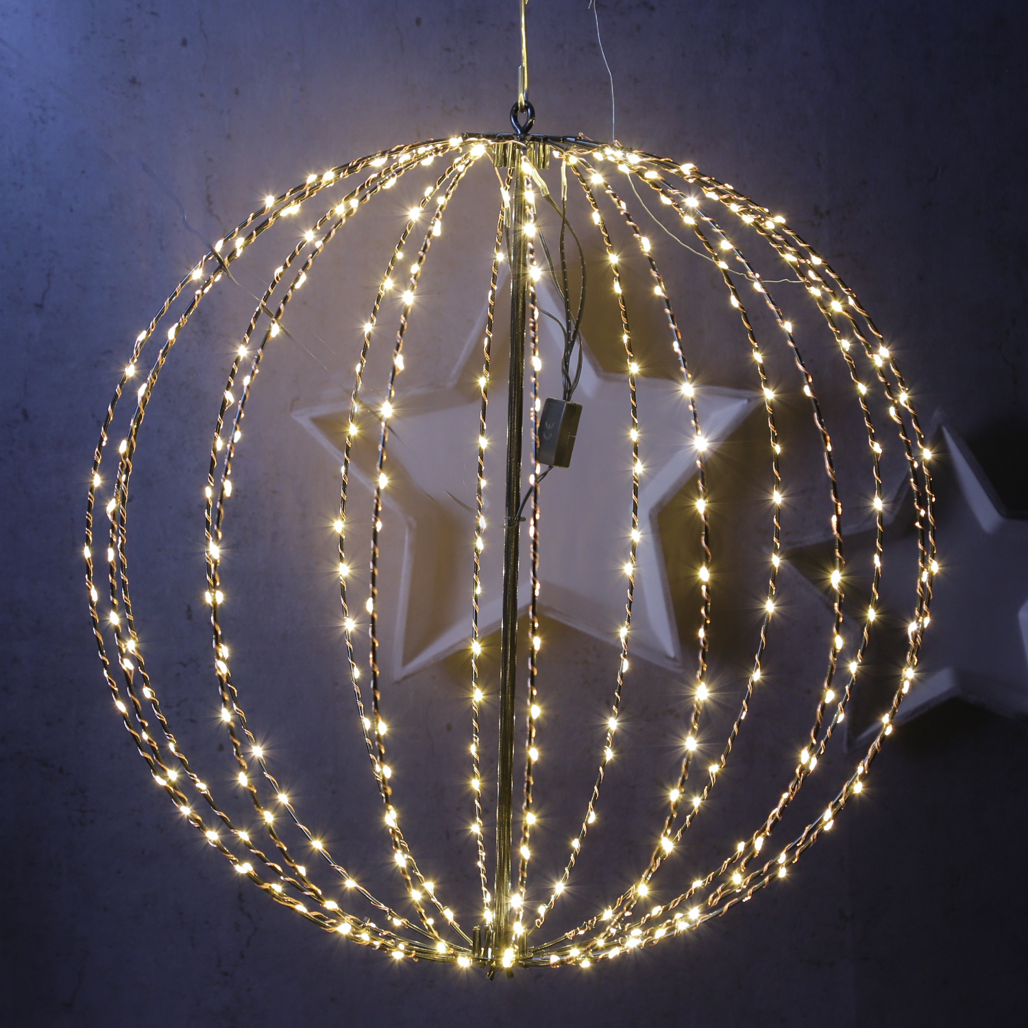 Die dekorative LED Drahtkugel mit 320 warmweißen LED ist ein richtiger Blickfang in jedem Raum. Du kannst die LED Kugel hängend oder auch auf dem Boden liegend präsentieren. Dabei bleibt es Dir überlassen, ob Du Deine Leuchtkugel Innen oder Draußen einsetzt. Die Kugel und auch der Trafo sind wetterfest und so leuchtet sie zu jeder Jahreszeit.