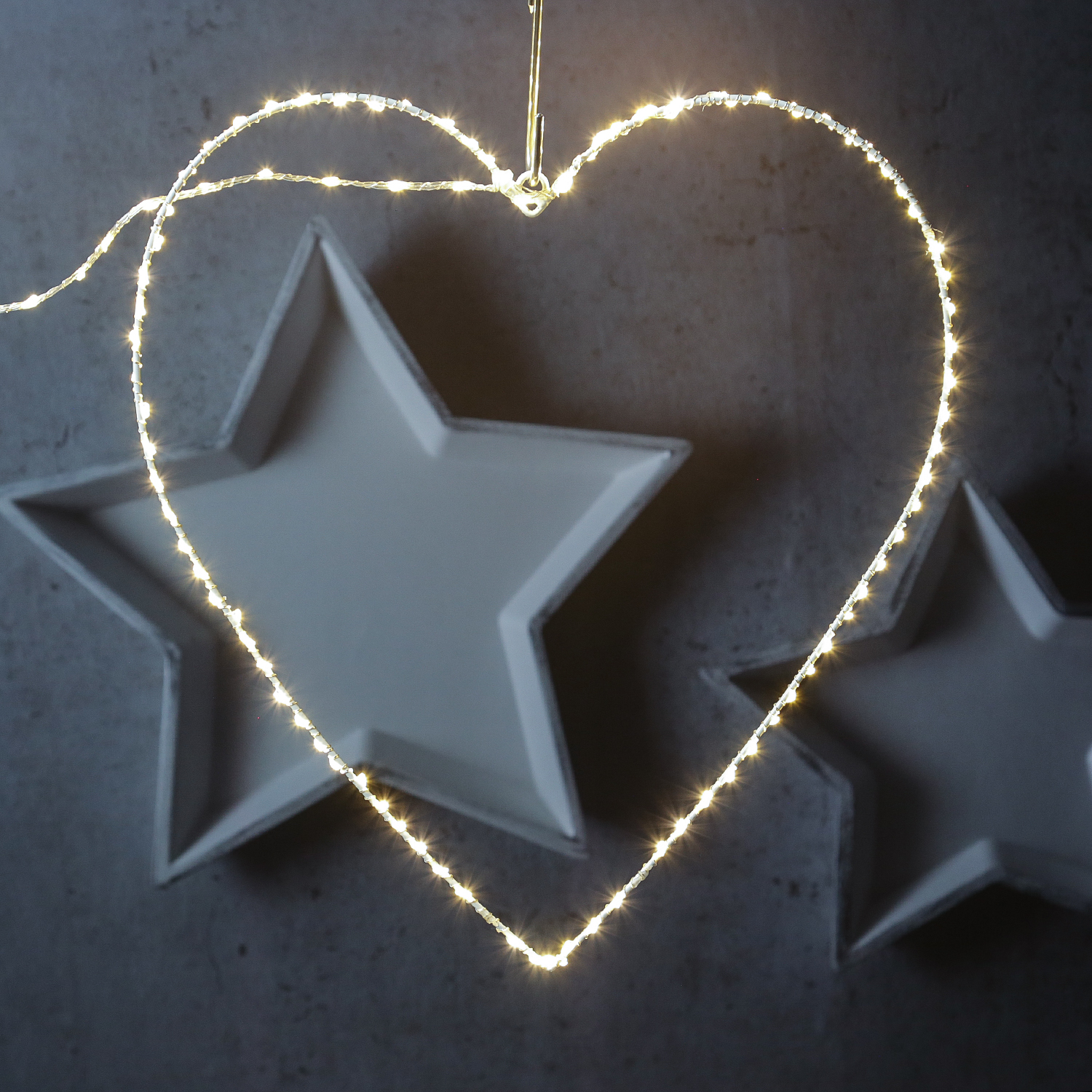 Die warmweißen LED an der Drahtlichterkette lassen das weiße LED Metallherz strahlen! Besonders klasse ist, dass die Zuleitung ebenfalls mit den LED bestückt ist und leuchtet.