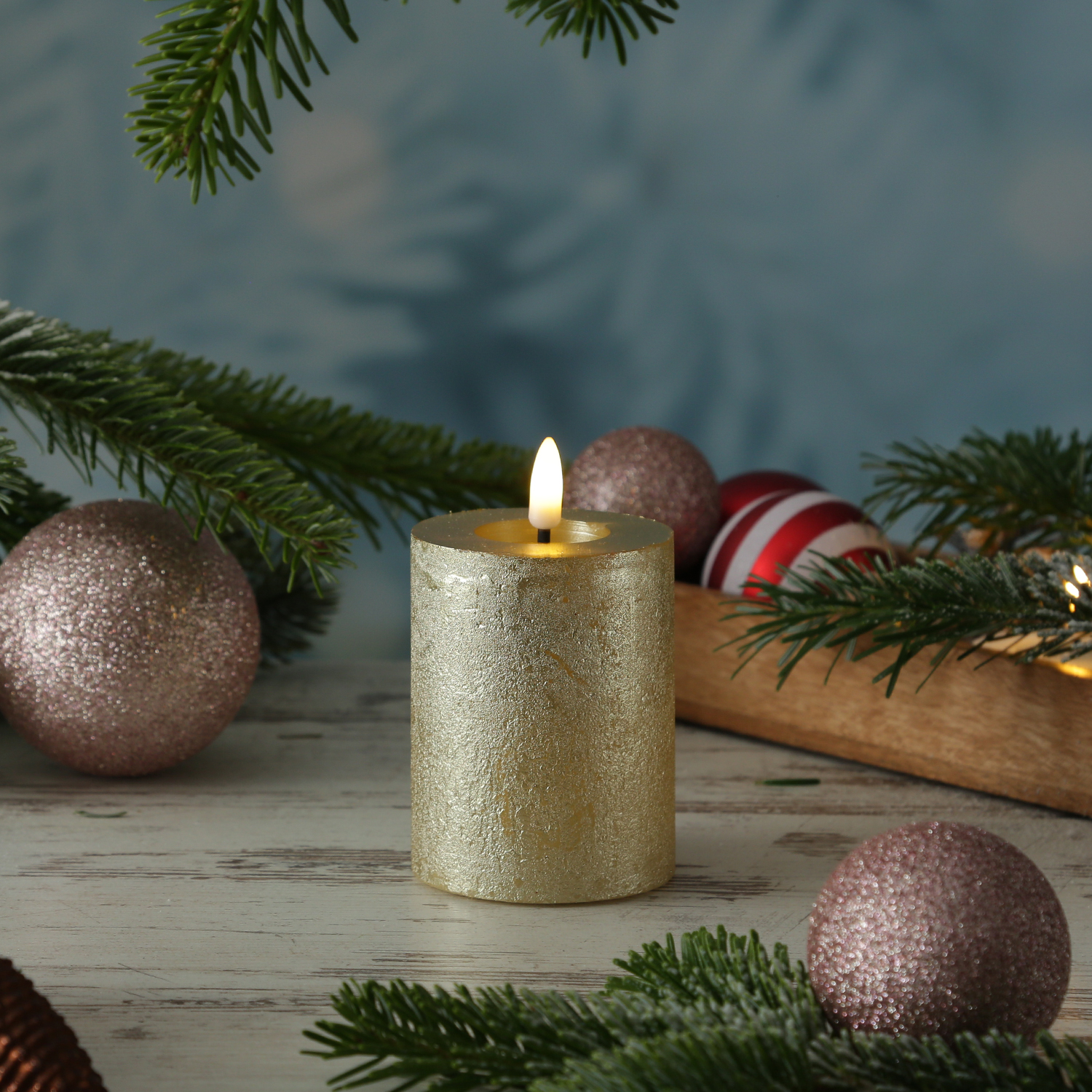LED Kerze LINA - Rustik-Optik - Echtwachs - 3D Flamme - H: 11cm - D: 7cm - Batterie - Timer - gold