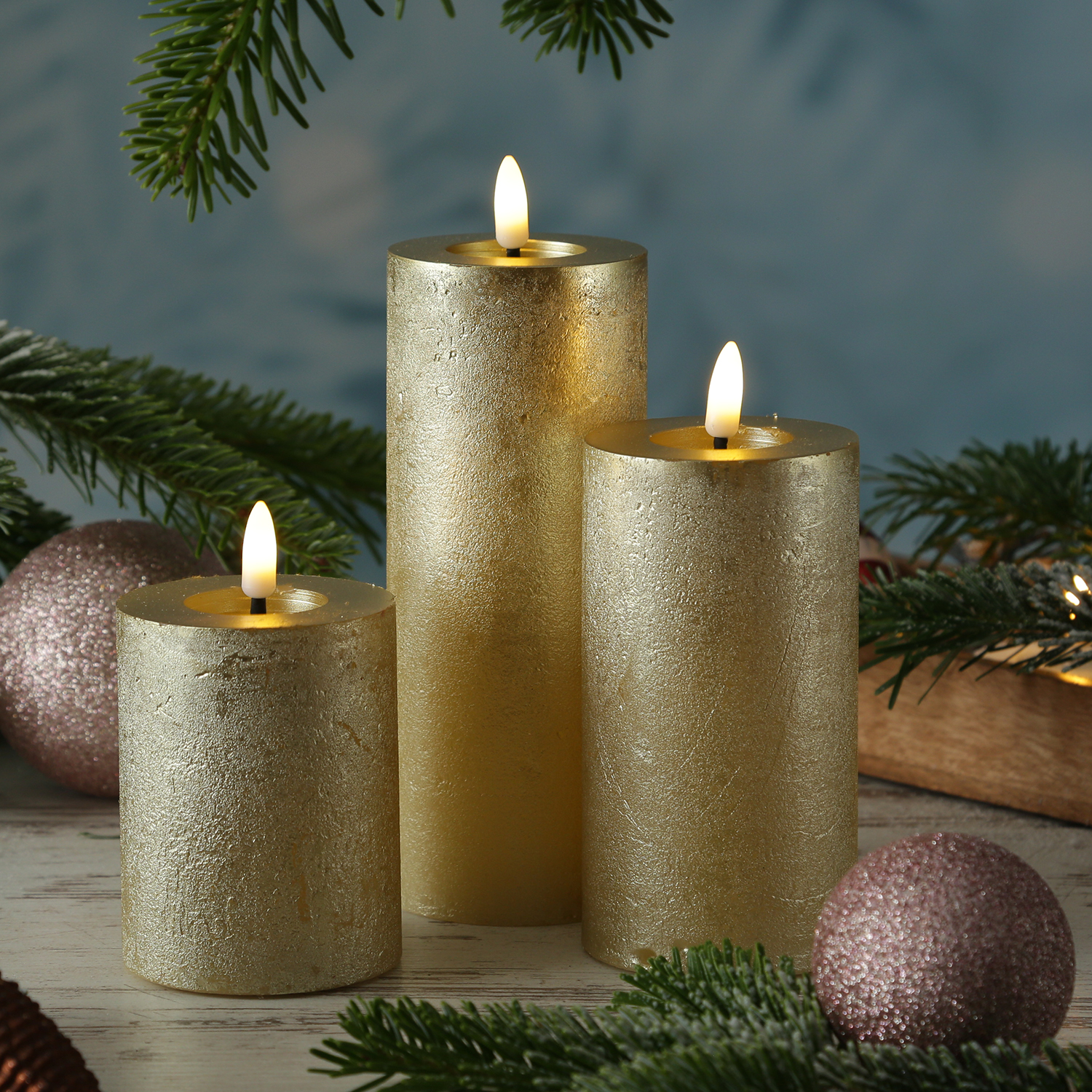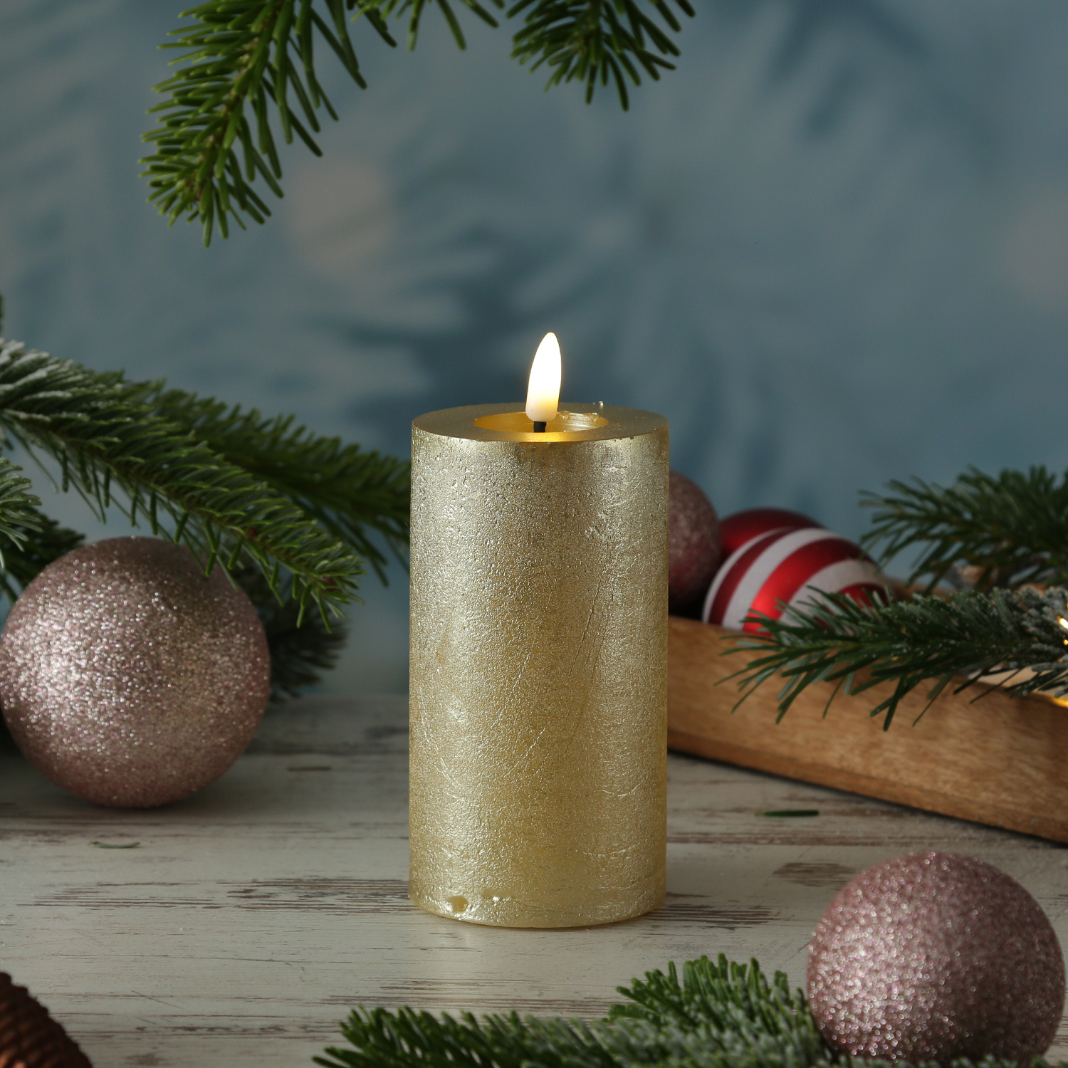 LED Kerze LINA - Rustik-Optik - Echtwachs - 3D Flamme - H: 15cm - D: 7cm - Batterie - Timer - gold