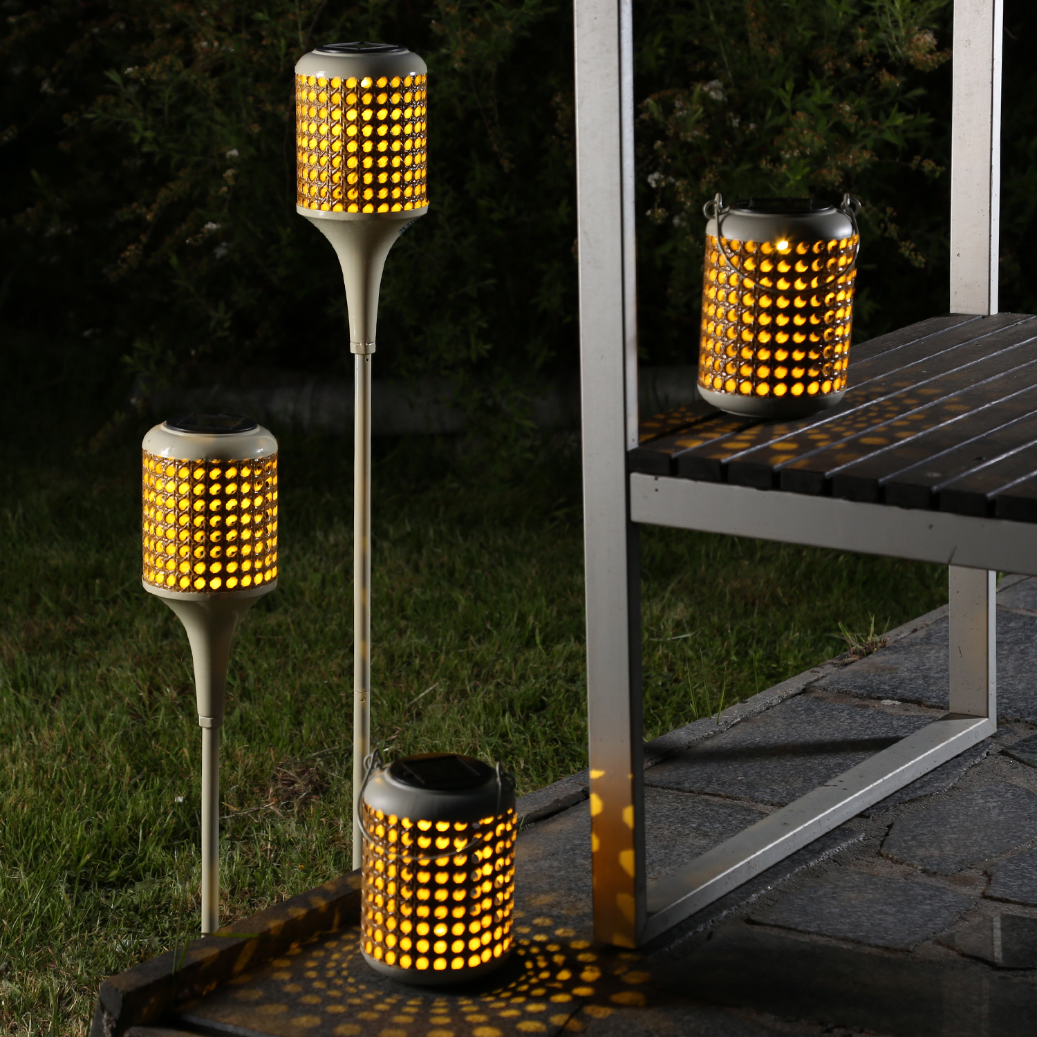 - LED Solar Laternen/Fackeln (2x mit Henkel, 2x mit Erdspieß)