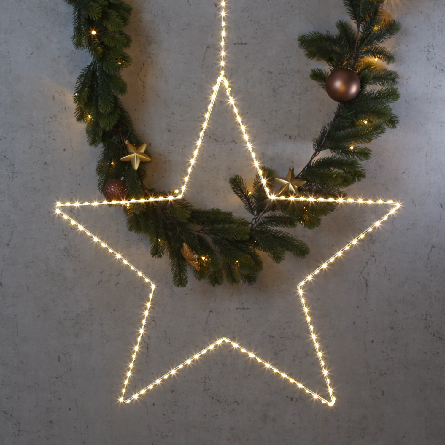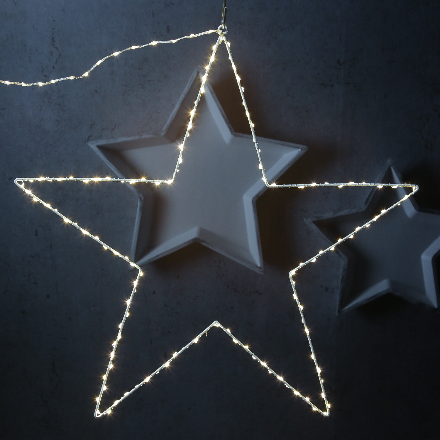 Die warmweißen LED an der Drahtlichterkette lassen den weißen LED Metallstern strahlen! Besonders klasse ist, dass die Zuleitung zum Teil ebenfalls mit LED bestückt ist und leuchtet.