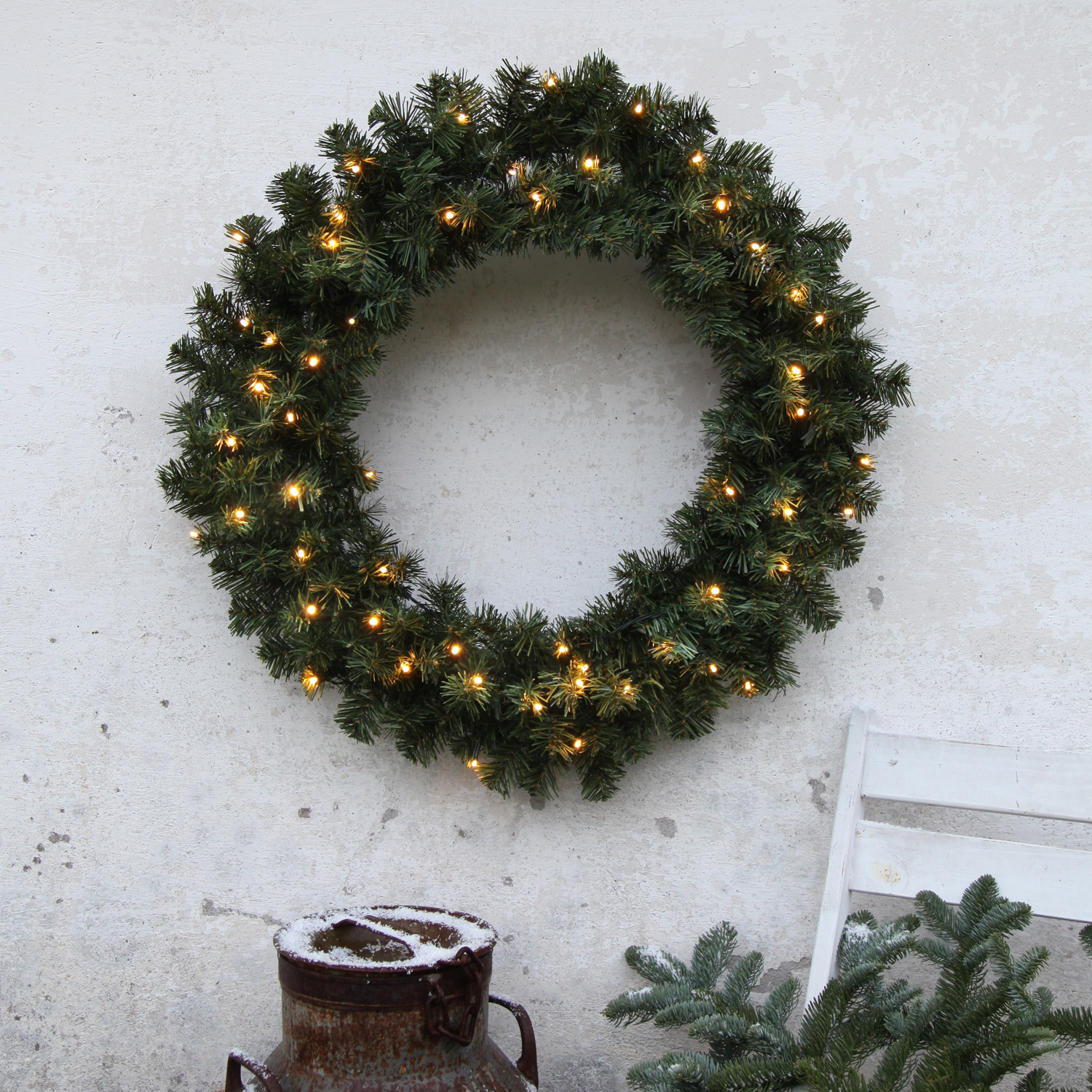 Dieser große, wetterfeste Türkranz mit 50 warmweißen LED eignet sich gut als Grundlage zum Basteln. Verziere ihn ganz nach Belieben mit Bändern, Sternen, Kugeln oder besprühe ihn mit Schneespray.