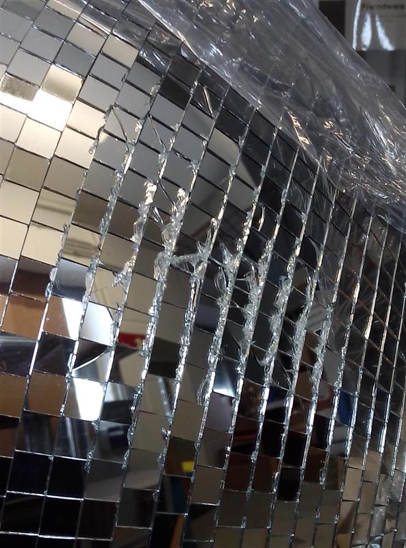 Um den bestmöglichen Effekt zu erzielen, sind die Spiegelfacetten auf 10x10mm geschnitten und nahezu lückenlos verklebt. Dadurch wird möglichst viel auftreffendes Licht reflektiert und in Strahlen aufgebrochen. Das ergibt den legendären Diskoeffekt, der bis heute nichts an Attraktivität verloren hat.