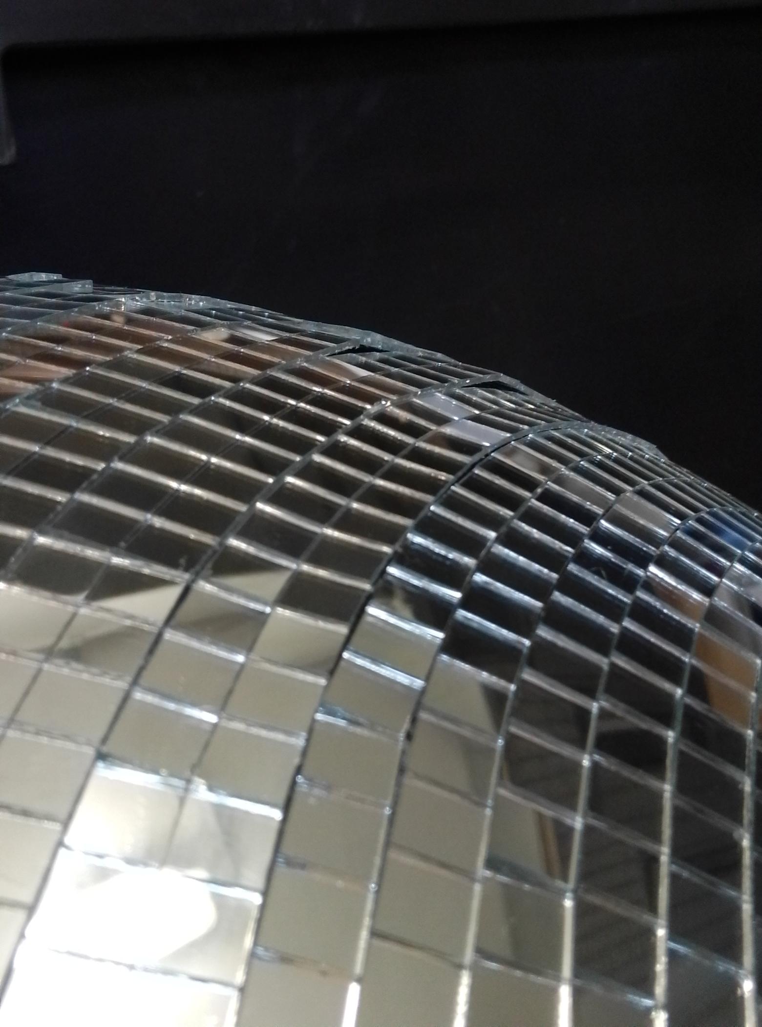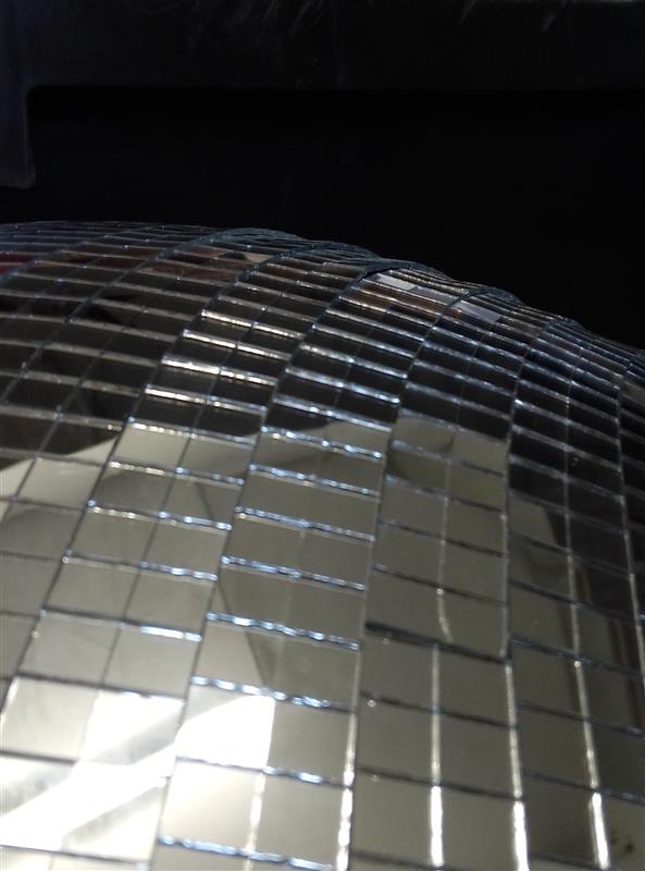 Um den bestmöglichen Effekt zu erzielen, sind die Spiegelfacetten auf 7x7mm geschnitten und nahezu lückenlos verklebt. Dadurch wird möglichst viel auftreffendes Licht reflektiert und in viele feine Strahlen aufgebrochen. Das ergibt den legendären Diskoeffekt, der bis heute nichts an Attraktivität verloren hat.