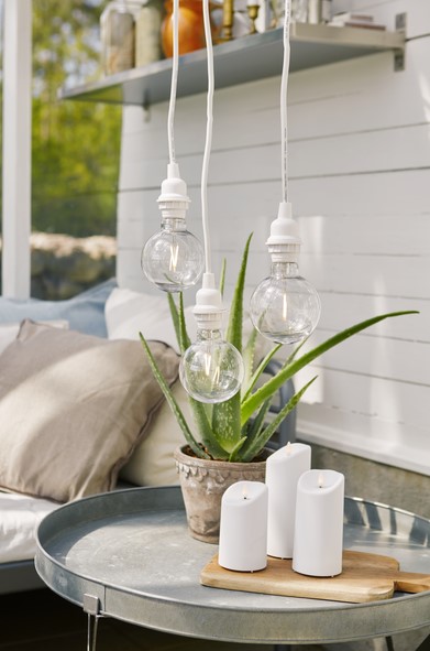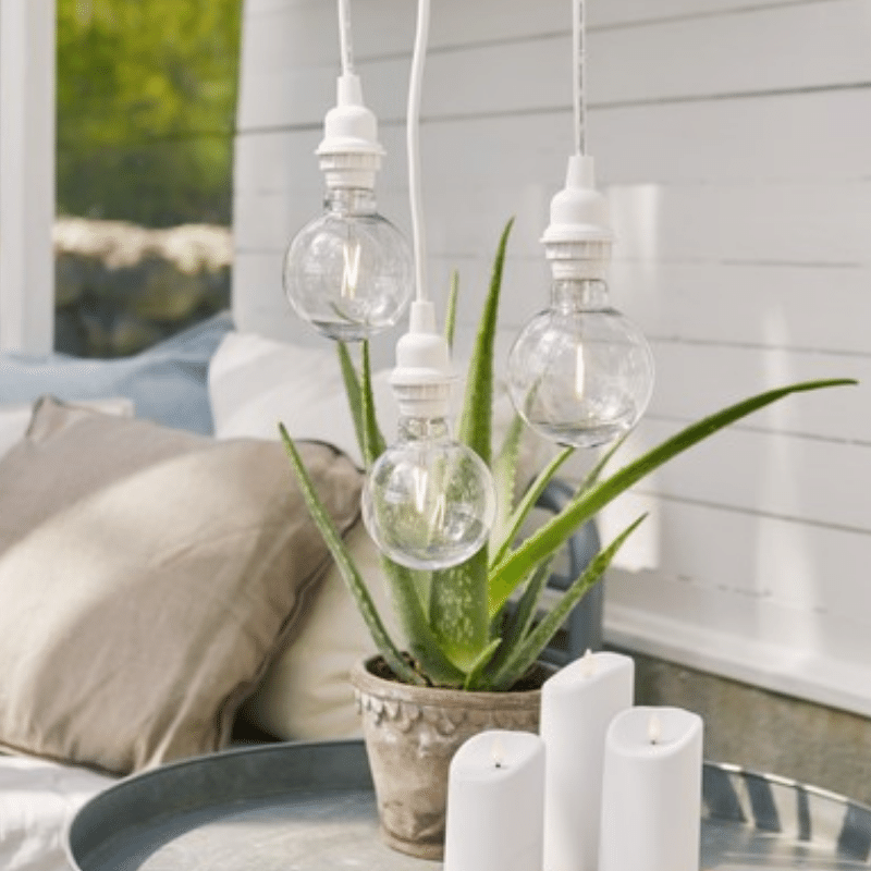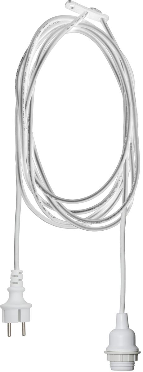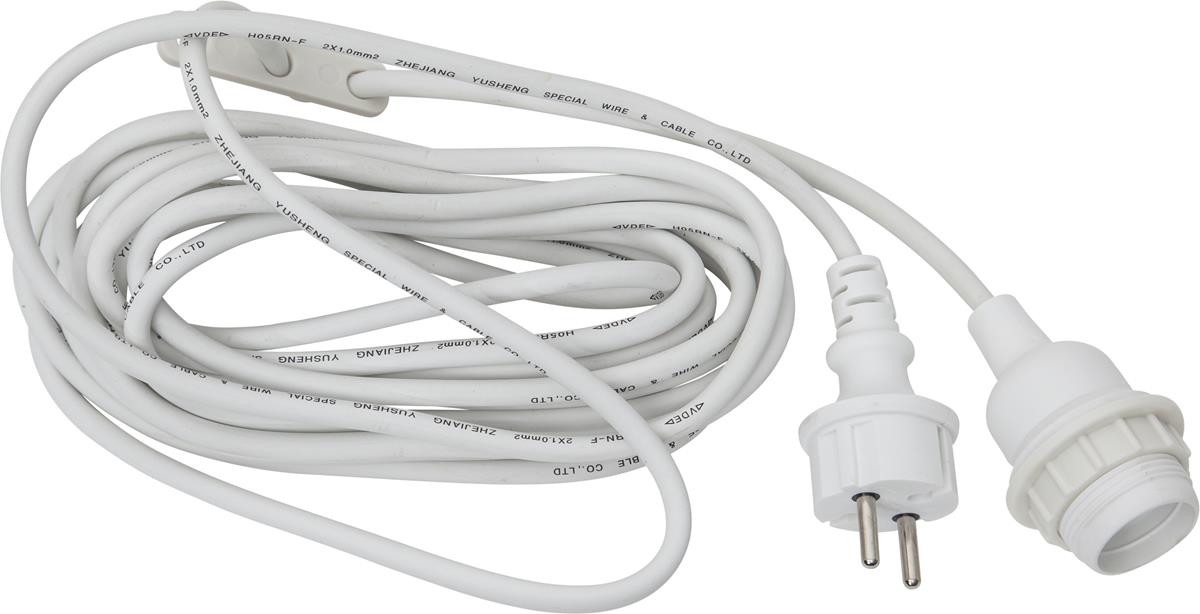 System CONNECTA WHITE - E27-Fassung "Ute" weiß - für den Außenbereich - 5m - max 25W Hängende Fassung für Designleuchtmittel oder Lampenschirme. Das 5m lange Gummikabel mit der E-27 Fassung kann Leuchtmittel bis zu einer Leistung von 25W aufnehmen. Frei hängend trägt es bis zu 2kg Last. Daten: Kabel: H05RN-F Max Belastung: 25W Rating: IP44 Schraubfassung: E27 Kabel-Aussendurchmesser: 6mm Leiterquerschnitt: 2 x 1mm