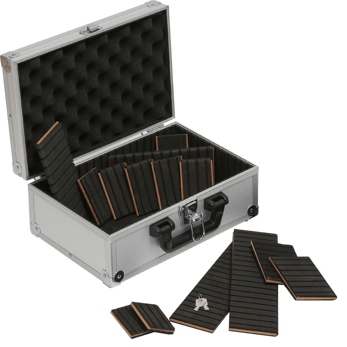 Der Koffer hat einen mit Noppenschaumstoff ausgekleideten Deckel, der den Inhalt in Position hält. Weiter liegen ein komplettes Set an Trennern in diversen Längen vor mit dem das Kofferinnere flexibel unterteilt werden kann.