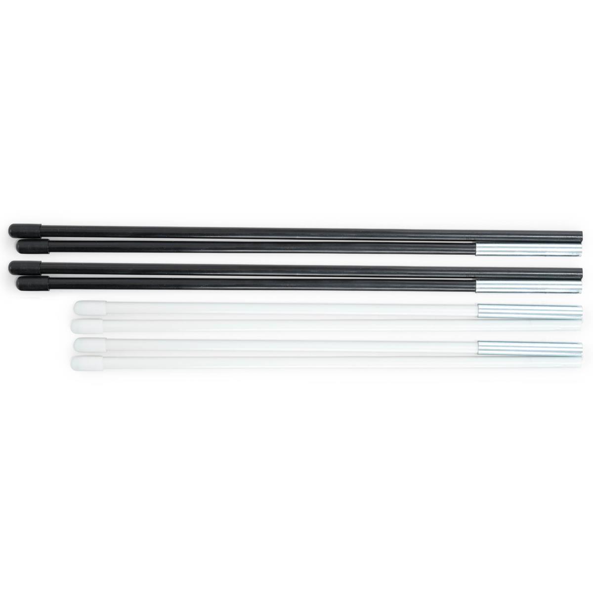 Das Zelt hat Türen auf der Seite und auf der Rückseite. Die Stangen sind aus glasfaserverstärktem Kunststoff.