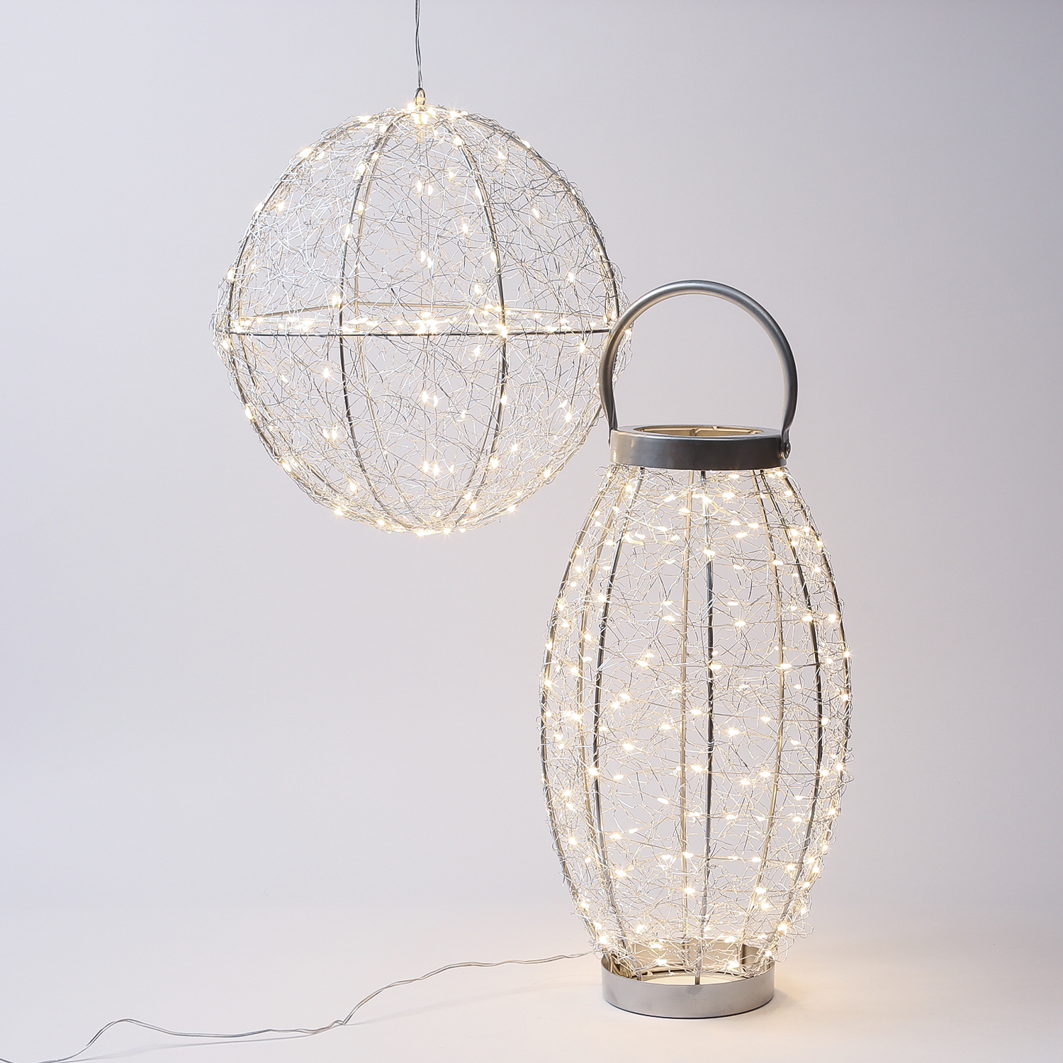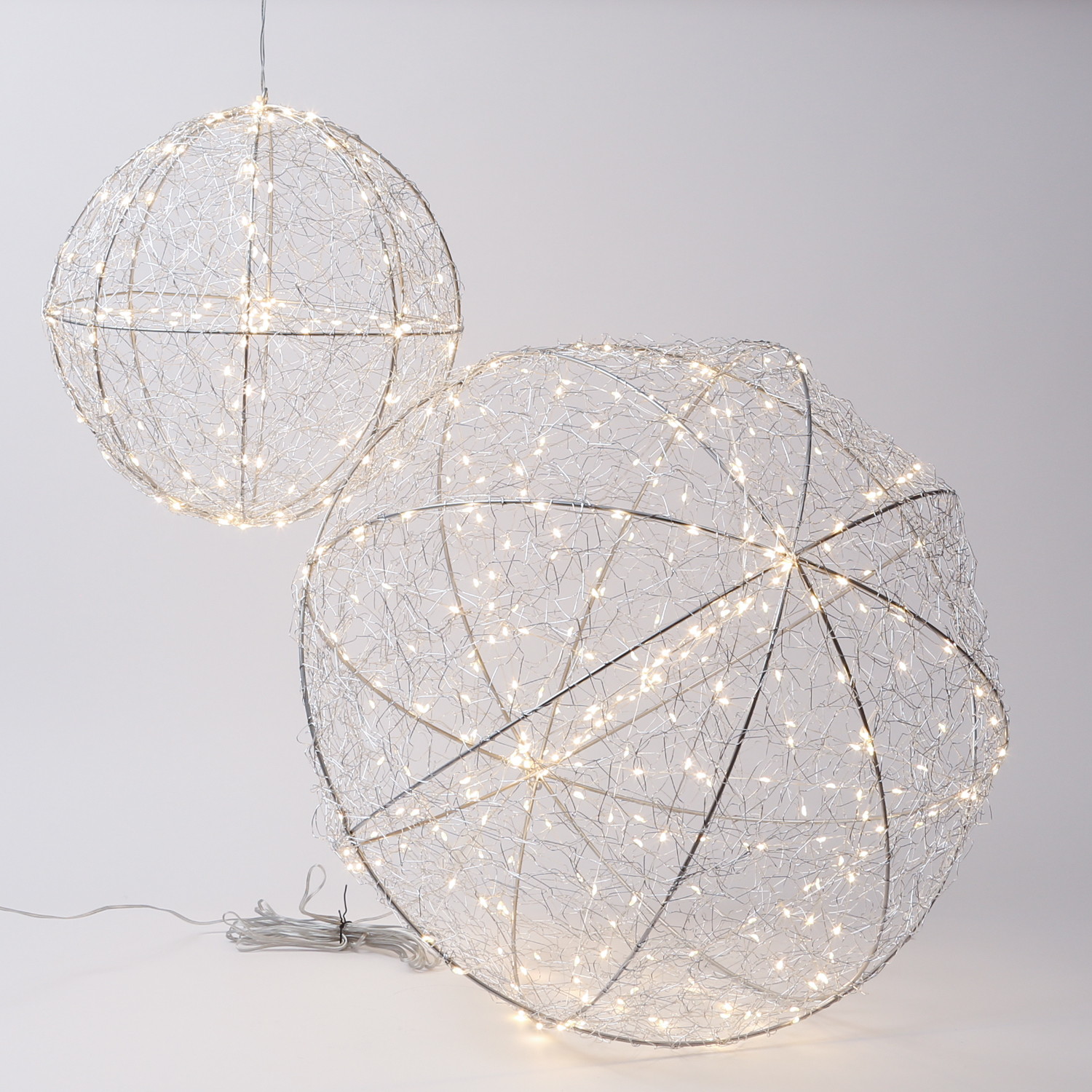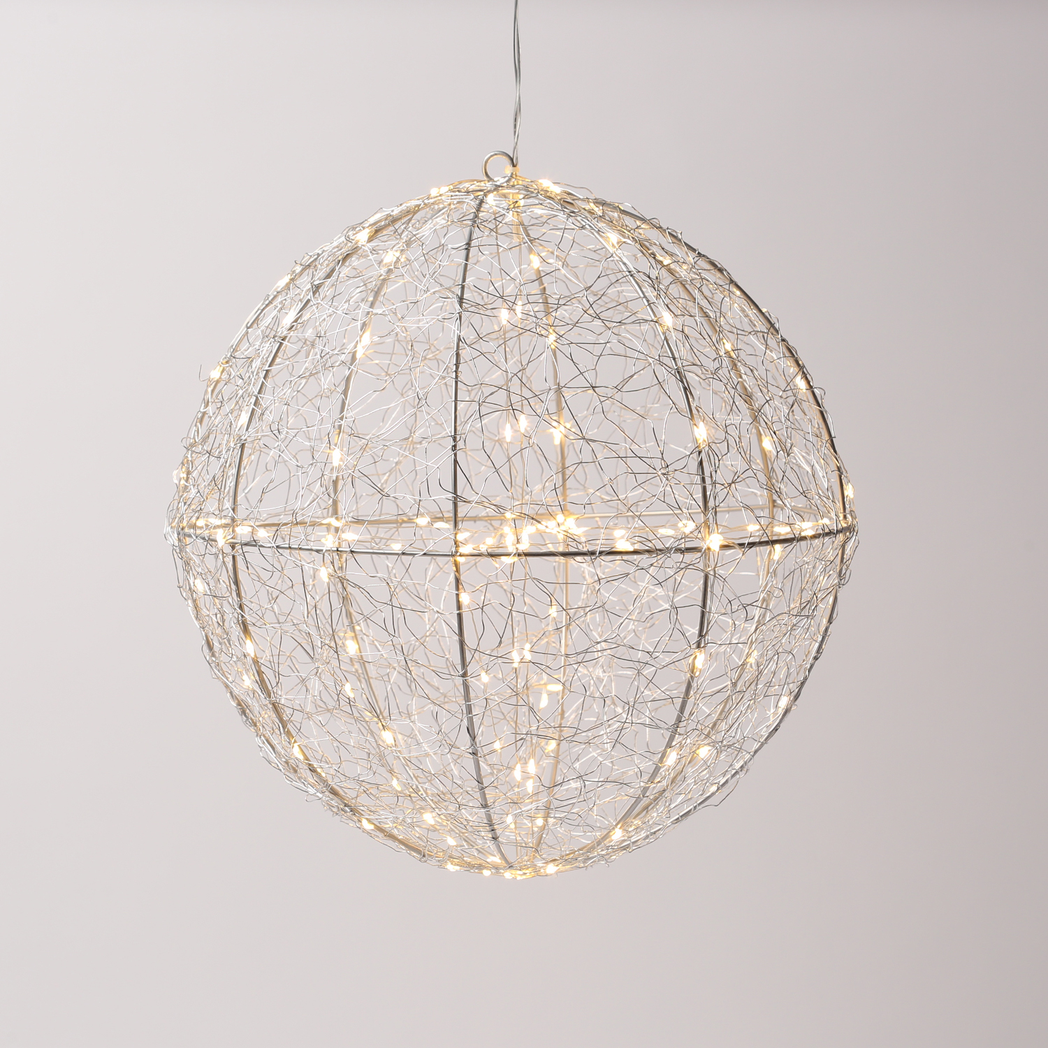 Dieser außergewöhnlich schöne Drahtball mit 150 warmweißen LED kann ganzjährig innen oder außen verwendet werden. Der dünne Aluminiumdraht in silber ergibt in Kombination mit den warmweißen LED ein sehr schönes Licht.