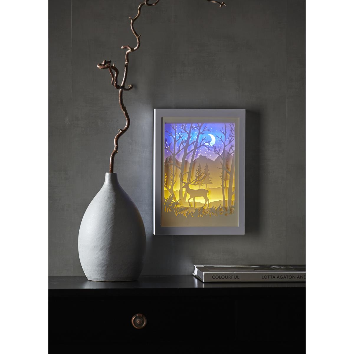 LED-Bild "Scenery"- Hirsch, mehrdimensional - weiss - 16 LED - mit Batterie oder Trafo - Timer