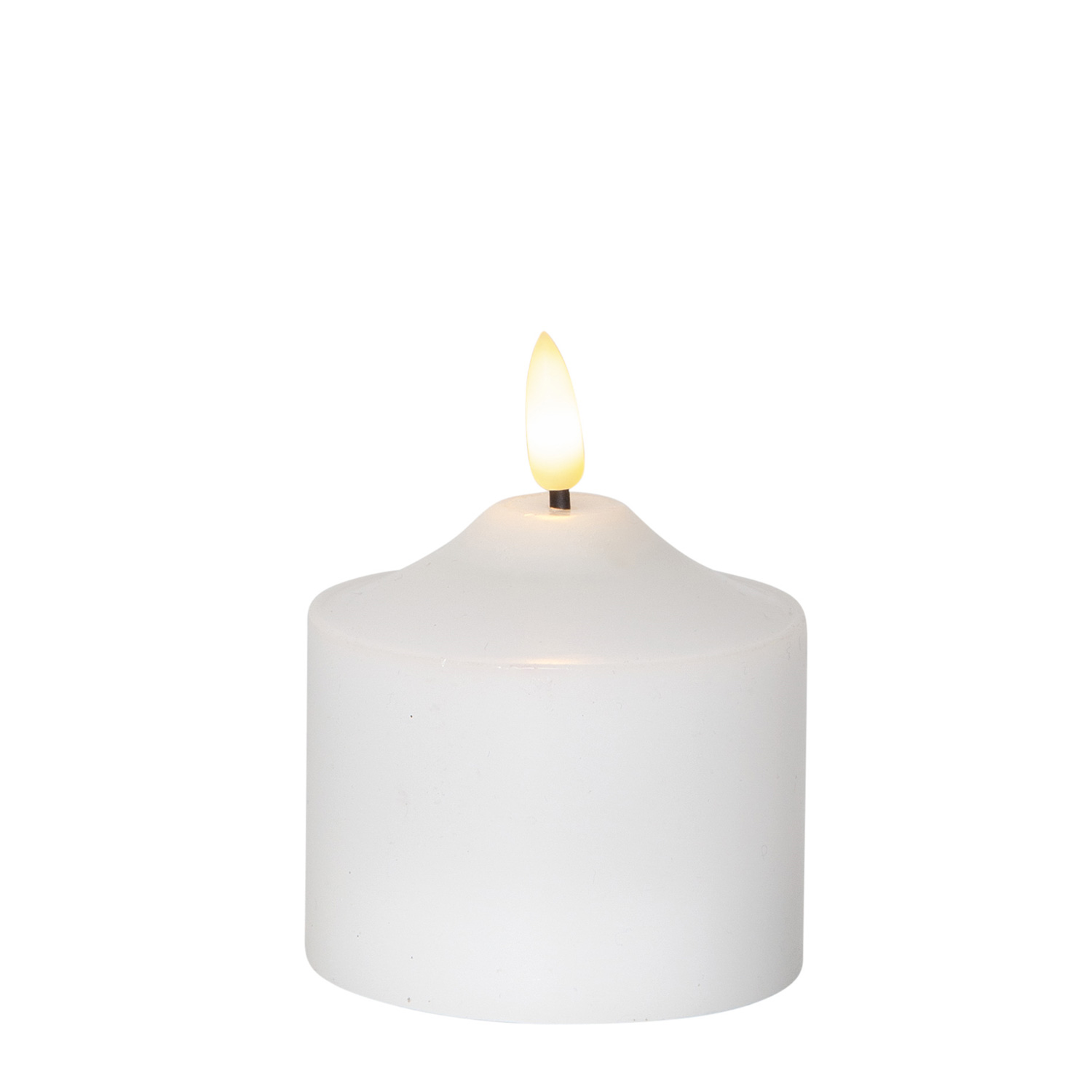 LED Stumpenkerze Flamme - Echtwachs - warmweiße 3D Flamme - H: 9,5cm - Batterie - Timer - weiß